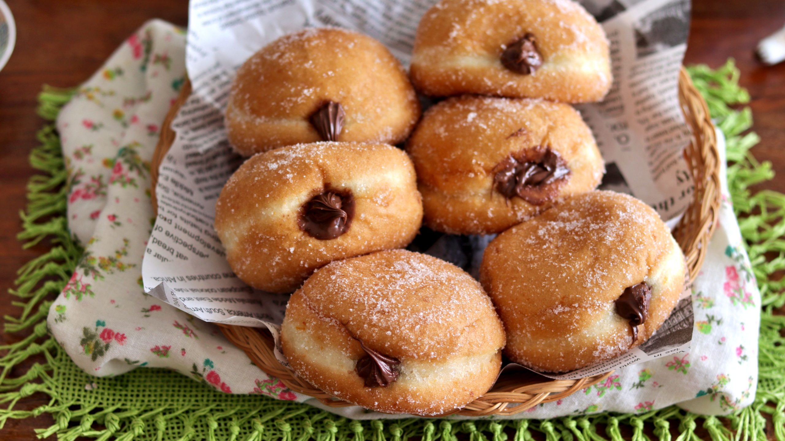 A seconda della temperatura ambiente, dovrai aspettare 60-90 minuti. Fai scaldare l’olio in un wok oppure una casseruola e, quando raggiunge i 160° circa, ritaglia la carta da forno attorno ai bomboloni e immergine due o tre nell’olio. Con le pinze, tira via i quadrati di carta da forno e lascia cuocerea fiamma bassa per circa 8 o 10 minuti. L’olio non dovrà mai superare i 150°-160°. Girali a metà cottura e, quando sono ben dorati, tirali fuori e poggiali su carta assorbente. Infine, passa i bomboloni nello zucchero semolato, poi crea un foro laterale e riempi ogni bombolone con la crema spalmabile.