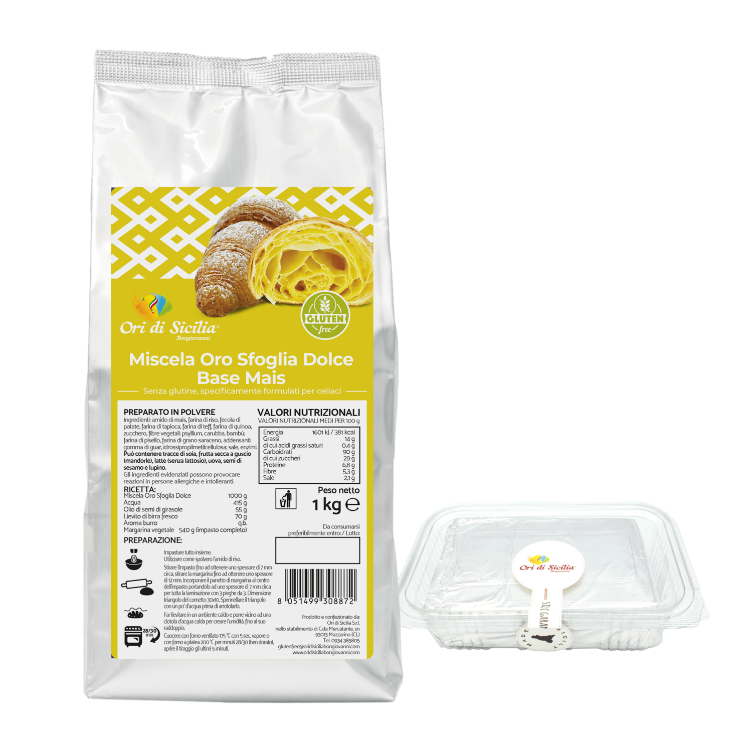 Due elementi perfetti per ottenere un croissant super sfogliato senza glutine – senza latte e vegan ! Contenuto del Croissant Kit Base mais Cod.articolo 887 – Oro Sfoglia dolce base mais