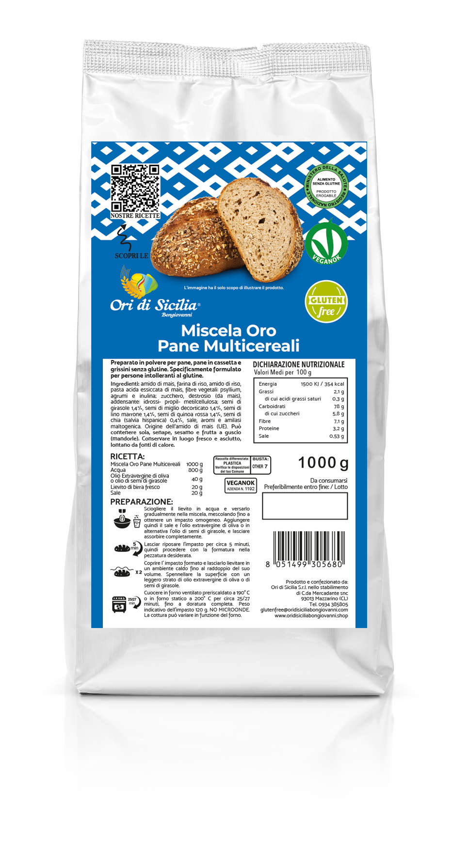INGREDIENTI: Amido di mais, farina di riso, amido di riso, pasta acida essiccata di mais, fibre vegetali: psyllium, agrumi e inulina; zucchero, destrosio (da mais), addensante: idrossi-propil-metilcellulosa; semi di girasole 1,4 % semi di miglio decorticato 1,4 %, semi di lino marrone 1,4 %, semi di quinoa rossa 1,4 %, semi di chia (salvia hispanica) 0,4 %, sale, aromi ed amilasi maltogenica. Origine dell’amido di mais (UE).